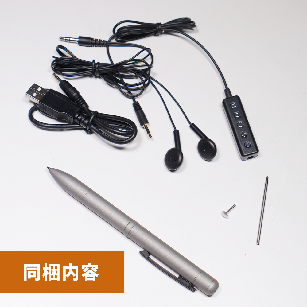 本体、専用USBケーブル、リモコン、イヤホン、ジャックキャップ、替え芯1本(本体1本内蔵の他)取扱説明書。