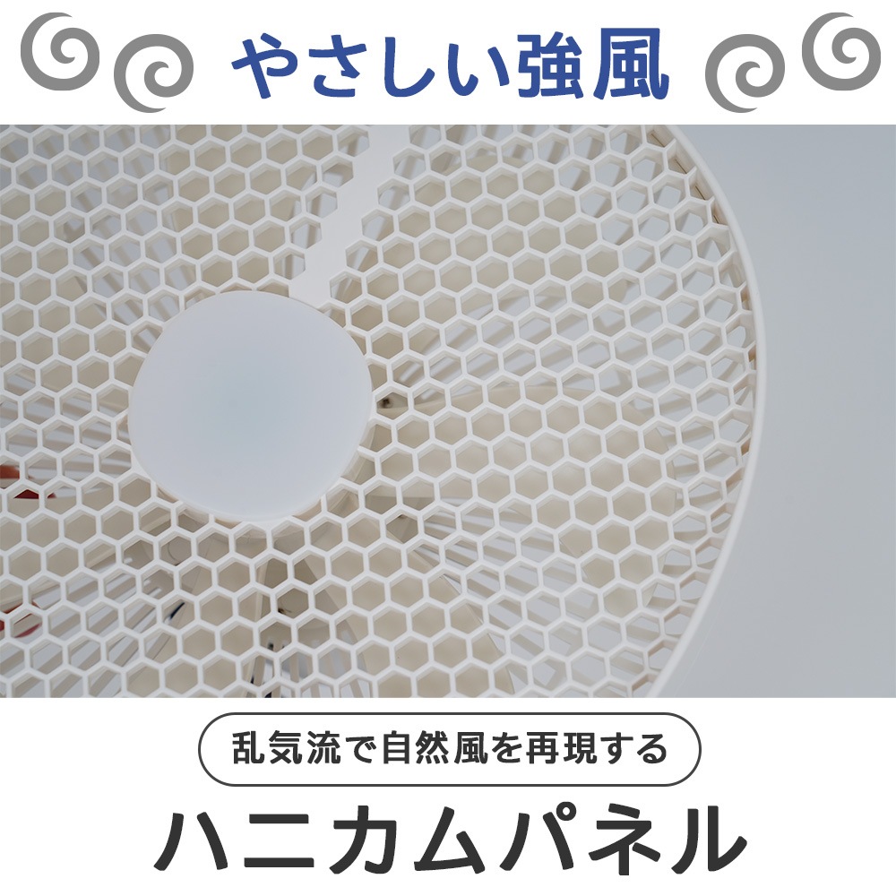 ハニカム構造で、通常の扇風機では感じたことがない包まれる感覚の強くて気持ちいい風が感じられ涼を得られます。