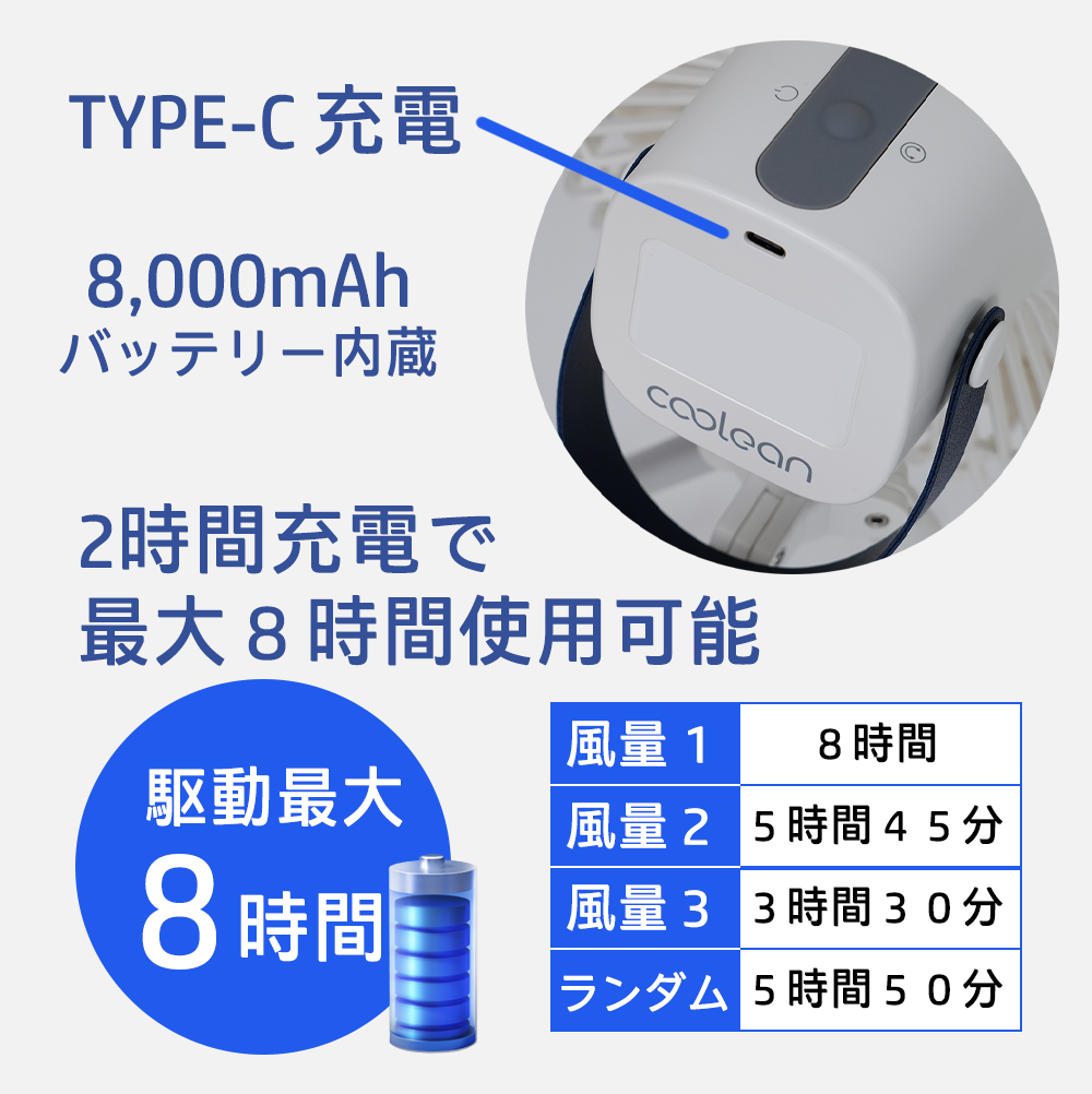 2時間充電で最大8時間使用可能